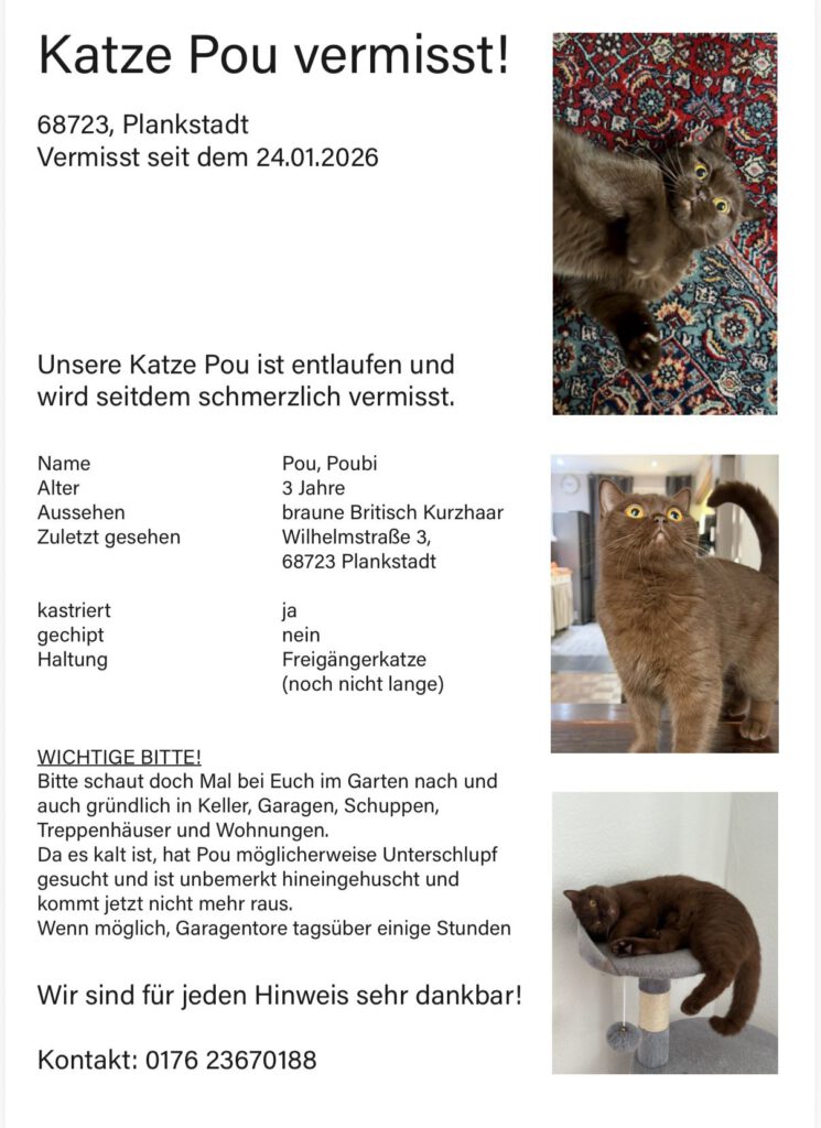 Die 4 Jahre alte Katze Pou, Britisch Kurzhaar, wird seit dem 24.1.26 vermisst. Sie ist braun, hat gelbe Augen, ist gechippt, nicht kastriert, wurde zuletzt in Plankstadt Wihelmstraße 3 gesehen. Sie ist eine Freigänger-Ketze, aber noch nicht lange. Da es zur Zeit draußen kalt ist, kann es sein, dass sie irgendwo Unterschlupf gesucht hat, unbemerkt hineingehuscht ist, und dort jetzt festsitzt, z.B. in ein Garagentor, das einige Zeit offenstand.
