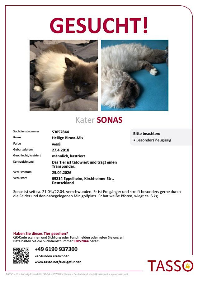 Sonas ist seit ca. 21./22. April in Eppelheim verschwunden. Er ist Freigänger und streift besonders gerne durch die Felder und den nahegelegenen Minigolfplatz. Er hat weiße Pfoten und wiegt ca. 5 kg.