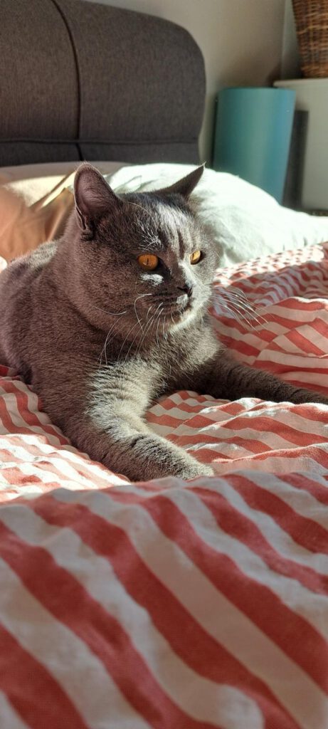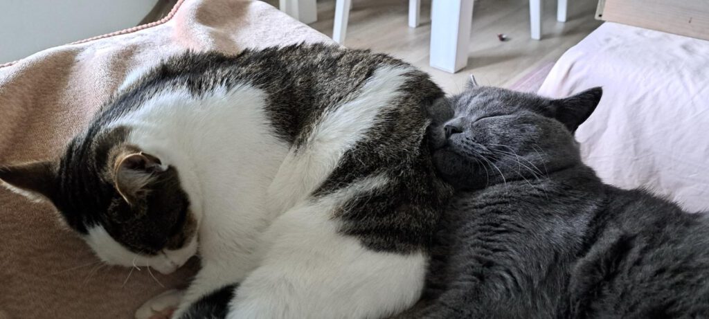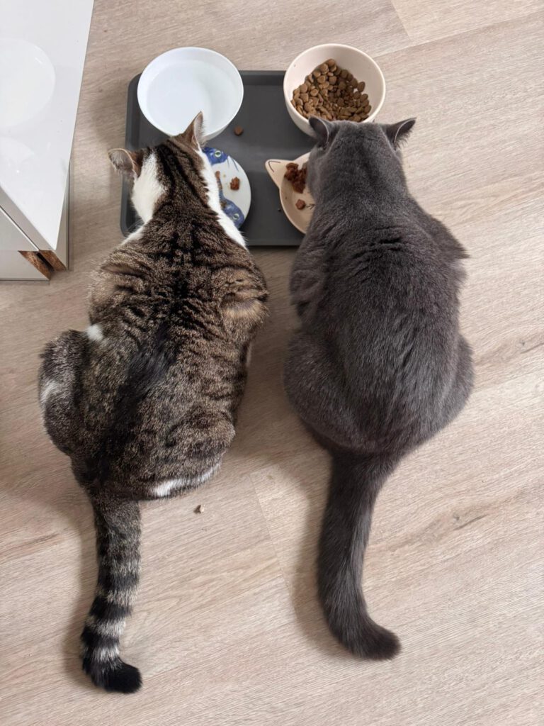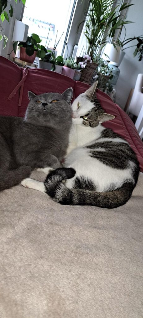 Balu (BKH) und Lizzy (EKH) suchen nur zusammen ein neues Zuhause. Balu ist ca. 2 Jahre alt, Lizzy fünf bis sieben. Balu ist von beiden der verspieltere: neugierig, aufgeschlossen und mit einem ganz sanften Wesen. Er liebt es, in der Nähe seiner Menschen zu sein. Wirft man ein Bällchen, rennt er voller Begeisterung hinterher, bringt es zurück oder spielt damit weiter. Ebenso gern springt er auf alles, was sich unter einer Decke bewegt. Dabei bleibt er immer geduldig und behält seine Krallen bei sich. Lizzy hingegen ist die ruhigere Beobachterin. Sie jagt gern dem Laserpointer hinterher und liebt ihr Katzenminze Kissen. Gleichzeitig liebt sie das Kuscheln und sucht oft die Nähe ihrer Menschen. Wenn sie ihre Ruhe möchte, zeigt sie das klar. Hat sie Vertrauen gefasst, bleiben auch bei ihr die Krallen drin. Zwischendurch liefern sich die beiden kleine Jagdspiele durch die Wohnung. Wobei Lizzy weniger Ausdauer hat. Insgesamt verstehen sich die beiden gut. Sie fressen notfalls aus einem Napf, putzen sich gegenseitig und schlafen nah beieinander. Lizzy ist Balu gegenüber oft sehr beschützerisch, fast wie eine große Schwester. Für beide wird ein Zuhause mit viel Platz zum Toben, Entdecken und Klettern gesucht. Ein kleiner gesicherter Garten zum Beobachten wäre ideal. Kleine Kinder und andere Tiere sollten nicht im Haushalt leben, da beide sehr schreckhaft und sensibel auf Neues und laute Geräusche reagieren. Wer Lust hat, die beiden kennenzulernen, wird zwei wunderbare Katzen mit viel Herz entdecken.